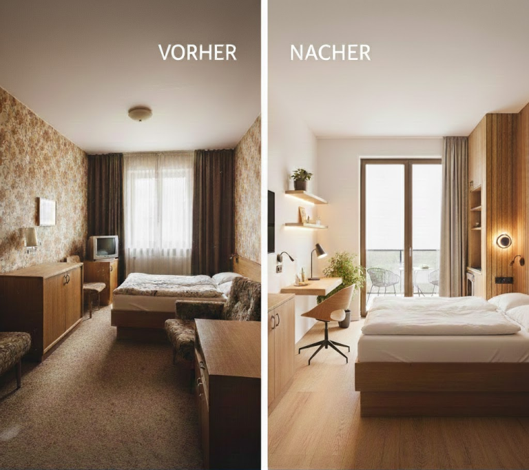 Früher waren Hotelzimmer starr. Eine Sanierung erlaubt es, Räume modular zu denken – zum Beispiel durch Verbindungstüren für Familien oder Zimmer, die tagsüber als Home-Office genutzt werden können. So nutzen Sie jeden Quadratmeter optimal aus.